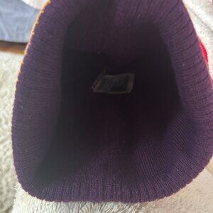 Wonderful pre-owned condition youth Converse hat. Orange stripes, text, and pom-pom on a purple background. Extremely tidy both inside and out. No stains or rips. Worn very few times. Warm, thick fabric that is stretchy and soft. Fit is youth size. Before listing, all used items are cleaned where necessary.
