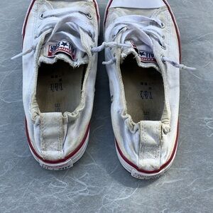 These Converse sneakers feature a classic white canvas upper with striking red accents, perfect for a timeless look. The low-top design includes a durable rubber toe cap and a textured sole for enhanced grip. A signature Converse All Star patch adds a touch of iconic branding. Sneaker / running shoes