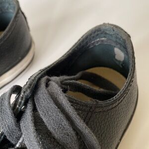 Converse black youth kids size 1 shoes. Signs of use. Some separation near where the toe bend is. Creasing present. Scuffing and marks also present.