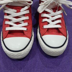 Red Converse high top sneakers with a retro feel. Belonged to my husband who kept them in great condition. There is very little wear except for on one of the soles which I took a photo of. The design of these ones was a limited run I believe, so they are really rare shoes! The insole is removable and has lots of cushion. They are unisex and the size says mens 6.5 or women's 8.5.