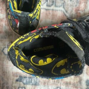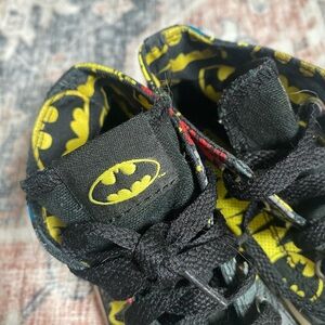 Vibrant Batman-themed high-top sneakers. Features bold comic graphics. Black laces and white soles.