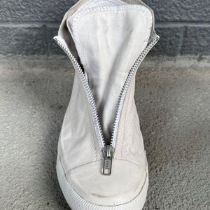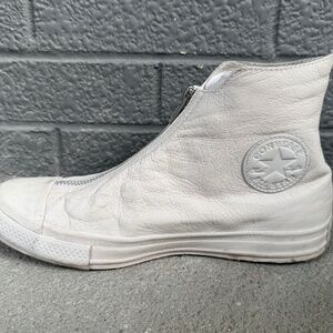 Sleek and minimalist Converse high-top sneakers crafted from supple white leather. Featuring a rare and striking front-zip design with no laces, tonal embossed All Star patch on the outer ankles, and classic rubber soles. Made in Vietnam.