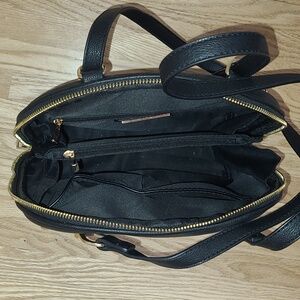 Black bag with gold accents. Can be used as a shoulder bag or a backpack. Has 2 slip pockets on the outside and 2 zipper and 2 slip pockets inside. Hardly used and in excellent condition.