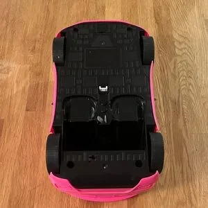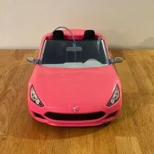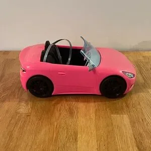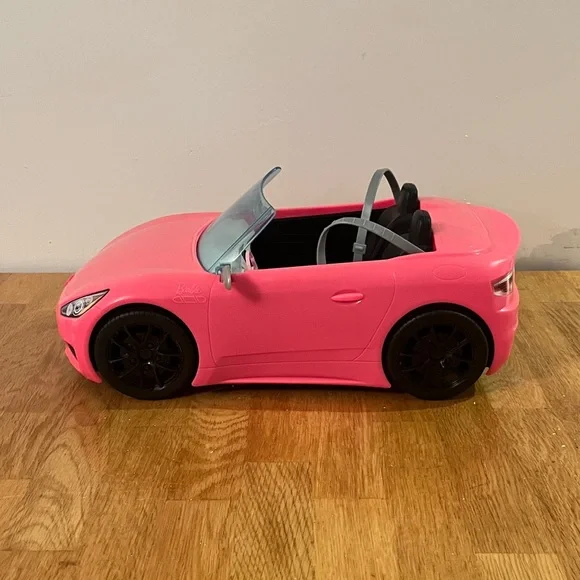 Chic Barbie convertible in vibrant pink. Features sleek black wheels and open-top design. Perfect for creative play.