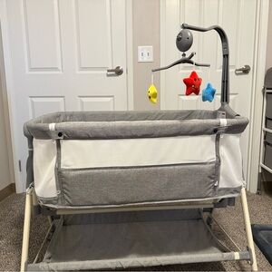 Baby Bassinet, 3 in 1 Bassinets Bedside Sleeper with Musical Toys, Rocking Bassinet for Baby with Storage Basket and Wheels, Adjustable Bedside Crib for Newborn (Grey) Convertible rocking bassinet with breathable mesh sides. Includes hanging star mobile. Neutral modern look. Easy-to-use conversion controls.