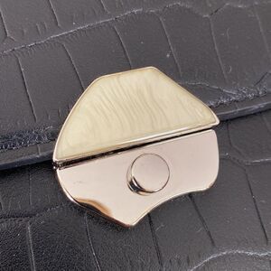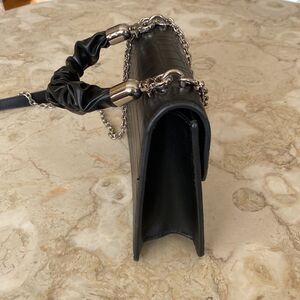 Metal silver tone shoulder strap is removable. Also removable is the short handle, interior is cloth lined and totally clean.