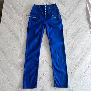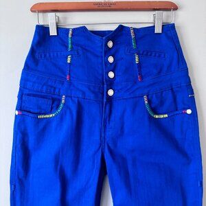 Embrace uniquely styled denim with these Australian-founded COOGI jeans (yes, they do more than just sweaters!)... These stunning modern jeans feature plenty of unique details; they feature a high-waisted fit with a pointed waist, a four-button waist closure and colorful embroidery throughout. These jeans are made from a mid-weight denim twill in a bight blue. They have a classic five-pocket design and a straight/skinny jean silhouette. Bright stitch embroidery in red, orange, yellow, green and blue adorns the front pockets and waist, as well as two huge 'C' embroideries on the back pockets.