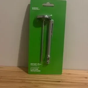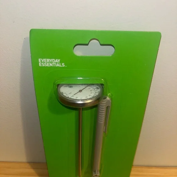 Everyday Essentials cooking thermometer with a silver probe and white dial. Comes with a green packaging.