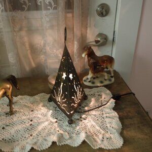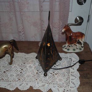 Vintage lamp made in Indonesia ,has stars and sun on it .The lamp is 12 inches tall. Metal lamp Moroccan style. Working lamp tried to take picture in the dark didn't work out to well. Very unusual lamp but cool hipi look.