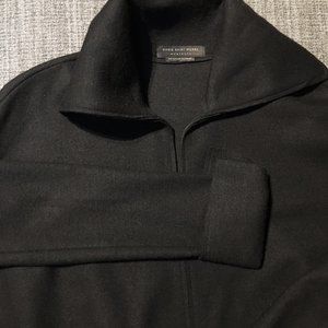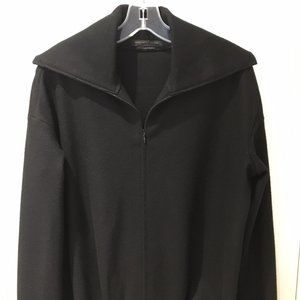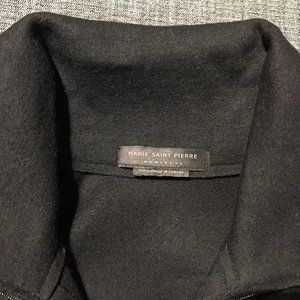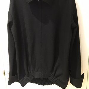 Black wool oversized jacket/overshirt by Mason Marie Saint Pierre in MSP size 2 (M, US/Canada 8). Slightly dropped shoulders, extra long sleeves with fold-up cuffs. Sharp pointed collar. Front zip closure. Ruched hemline with elastic back and front, longer in the back, which creates a nice slightly poufy silhouette. About 27 inches / 68.8 cms long in the front; 30.5 inches/ 77.5 cms long in the back. Underarm to underarm flat is 25 inches/ 63.5 cms. Unlined. 100% wool. New, never worn, with tags (detached). Retailed for $940. Smoke and pet free home.
