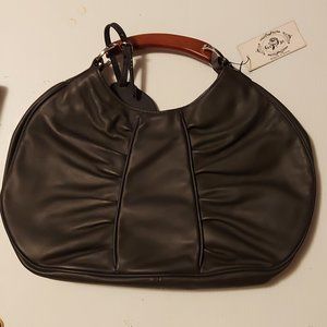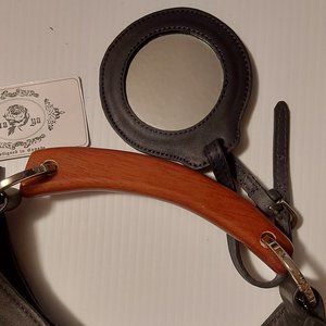 Wood handle Hand bag. Small matching mirror, detachable. 18" across at widest point, 12" high at highest point, 3" wide. Gorgeous charcoal Grey color with milk chocolate brown wood handle. Brand new. Canadian design.