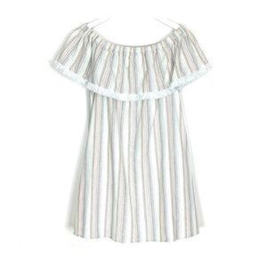 Off-shoulder lined Cooper & Ella striped mini dress with fringe detail.