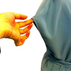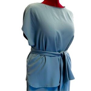 Handmade (by me!) two piece, relaxed fit pant suit. Blue-grey minimalist outfit is simple yet elegant. Slip over top features a boat neck and raglan shirt sleeves. Relaxed pants have an extra wide leg with an elastic waist and two side pockets. Crepe de chine fabric delivers beautiful drape. Finished surged edges inside. Comes with belt shown.