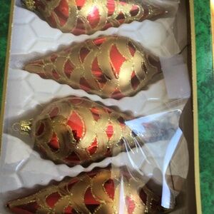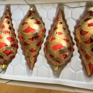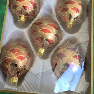 These 9 ornaments are in good condition and are in lovely shape. They are made in Romania.