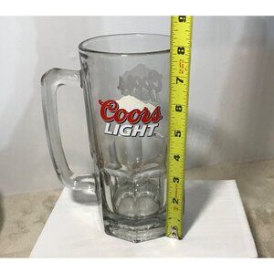 This Coors Light beer mug, made from robust and clear glass, offers a hefty grip perfect for enjoying a cold beverage. Standing 7 inches tall, it features the iconic Coors Light logo, making it an ideal addition for collectors and beer enthusiasts alike.
