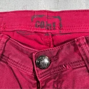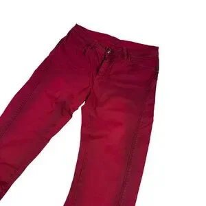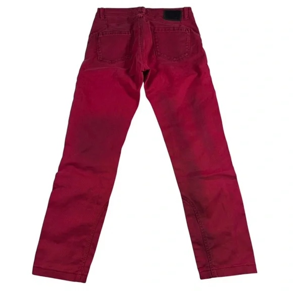 Bold, statement pants by Cop Copine in a deep ruby red. These stretch cotton blend pants are styled after classic jodhpurs, complete with structured seam detailing down the outer legs and decorative button accents on the hip. The unique cut offers a modern, flattering fit. They are in very good, preowned condition with a naturally faded wash that adds to their appeal. Waist measures approximately 13.5 inches flat.