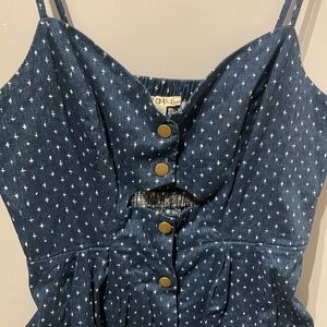 Cute snap buttons dress with a small peek a boo. Has pockets! Material is 100% cotton.