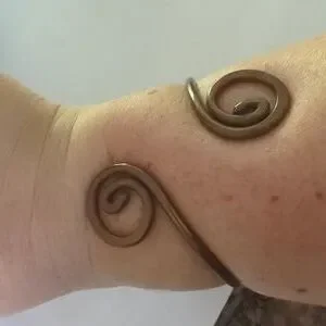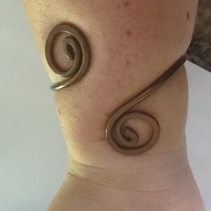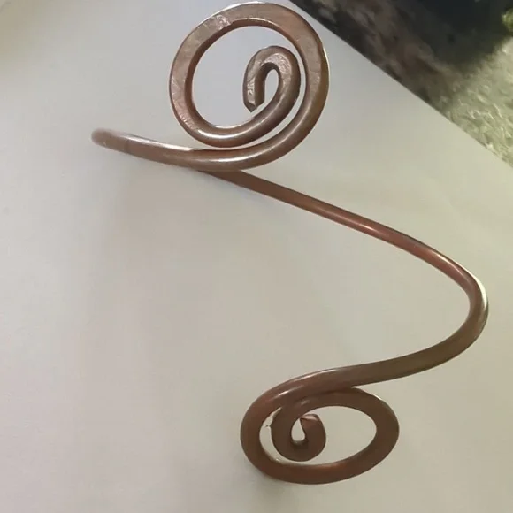 open cuff copper coloured bangle, not entirely of other alloys used. open style with curls at both ends. can be manipulated slightly to accommodate your arm.