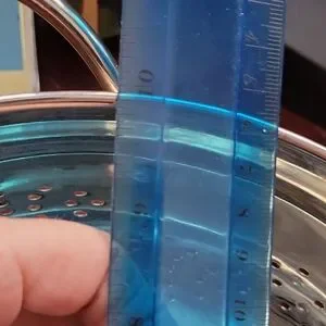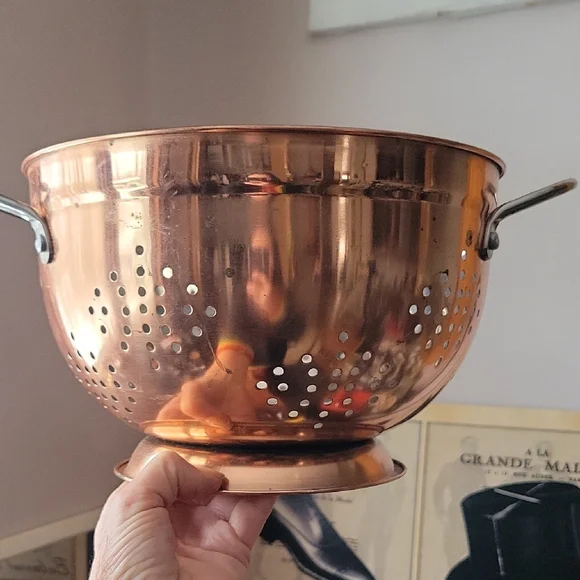 10 inches across and 6 inches tall. Elegant copper colander with sturdy handles. Perfect for kitchen use.