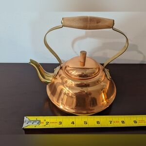 Beautiful copper tea pot. This tea pot is in over all good pre-loved condition. It does have some signs of minimal wear. Please see the photos of inside the pot, the spout and the wooden handle. This is still a beautiful piece for your home regardless of these flaws. Made in Portugal. Measurements 8" x 7".