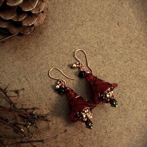Handmade Earrings, with a red floral and wire-wrapped design. Brand New; originally from my Etsy shop. Materials include: Copper ear-wires (Lead + Nickel-Free), chinese-crystal, glass-pearl, acrylic rondelle, & resin beads.