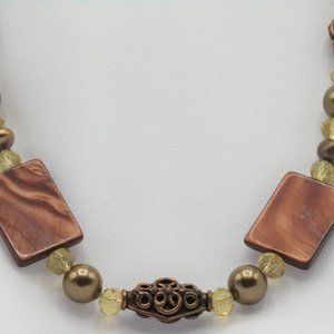 A NEW and HANDMADE chic copper and gold colour jewelry set. Includes necklace, bracelet and earrings. Each piece is hand-made and designed by me. I only make one of a kind. I use a wide variety of beads from ccrystals, glass, metals and semi-precious stones all to create unique and stunning pieces.