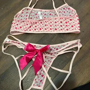 Coquette Red Heart Print Mesh 2 Piece Bra and Panties Lingerie Set OS