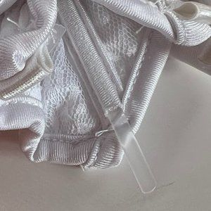 Very new, perfectly clean white. Gifted w/a hoop missing, however you can still get the ribbon through it. There is also one boning that slips out but can be sown right back! It is a size small but the ribbons are quite long. It is very thick and sturdy.