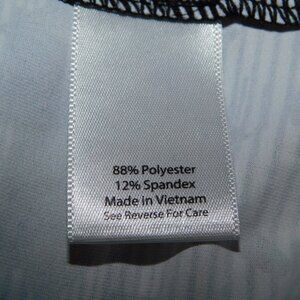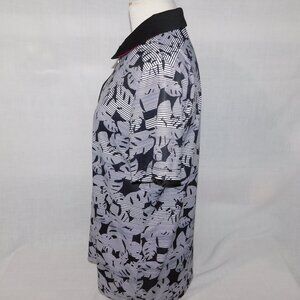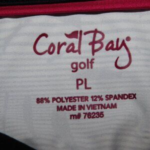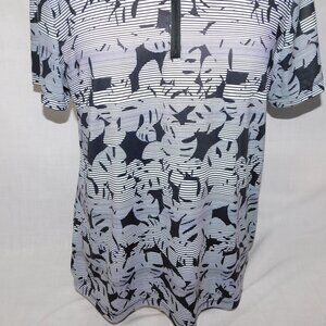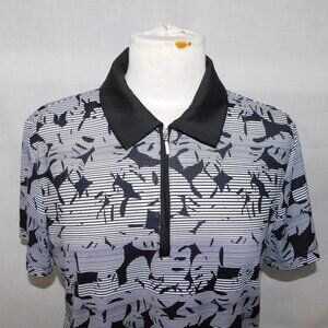 This Womens PL Petite Large Black White Striped Leaves 1/4 Zip Golf Polo Shirt is in great clean bright condition. Shirt is 88% Polyester - 12% Spandex - Machine washable. Quick Dry. Moisture wicking. UPF 50.