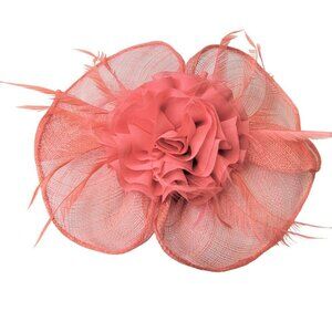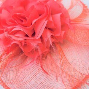 Coral Pink Fascinator with Soft Sinamay Mesh with Coral Feathers Floral Rosette Flower Accent