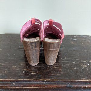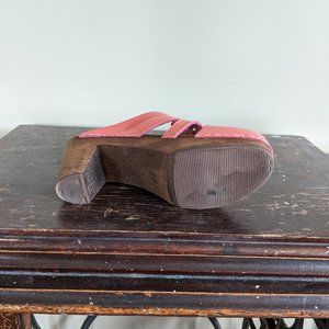 Bright Coral Pink leather with a Dark Brown wood sole.