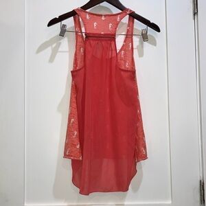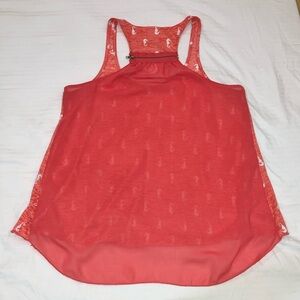 AI description: This pink tank top showcases an asymmetrical high-low hemline and a delightful white anchor pattern, perfect for a sunny day. The sleeveless design and scoop neckline provide a relaxed and airy fit, ideal for warm weather.