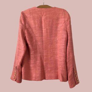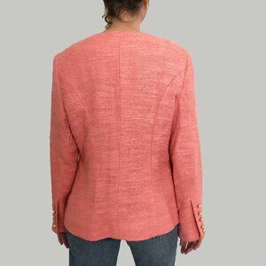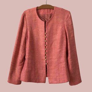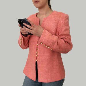 This stunning collarless blazer combines modern minimalism with timeless sophistication. Crafted from a coral-hued, textured silk-linen blend with a subtle shimmer, it features a sleek, fitted silhouette that flatters the figure. A row of pearly golden decorative buttons adorns the front and cuffs, adding a refined touch of detail. Fully lined for comfort and structure. Tailor-made, with no label. Estimated to fit a size M.
