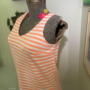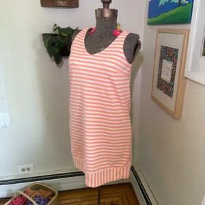 Stay cool and stylish in this breezy coral and white striped tank dress! Featuring a flattering sleeveless cut, soft stretch fabric, and a playful horizontal stripe pattern with a wide contrast stripe at the hem. Perfect for beach days, casual brunches, or layering over a swimsuit. Lightweight and comfortable, this dress is easy to throw on and go. Gently worn and in excellent condition.