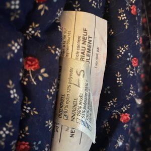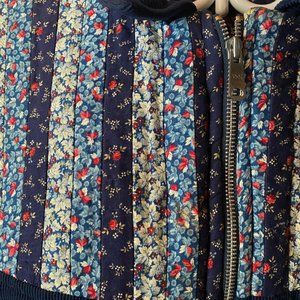 Colour: navy blue with blue, rose and white patterned floral fabrics for the quilted part. Interior of the jacket is a navy blue fabric with a small rose pattern.