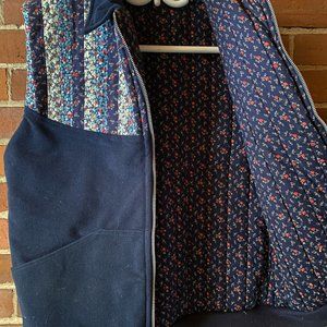 Vintage navy blue corduroy vest with quilted floral fabrics on front chest and two large pockets on the front. Zipper closure. The backside of vest is all corduroy.