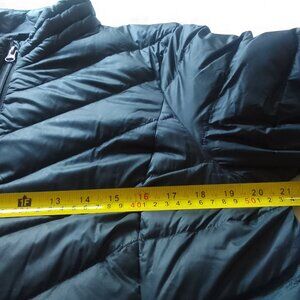 In good condition, lightweight travel friendly packable casual jacket. Front zipper closure and 2 front side pockets. 90% down filled, 10% feather . Nylon outer shell. Pit to pit approximately 21 inches, Length 26 in (size large)