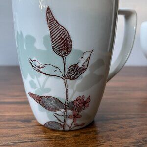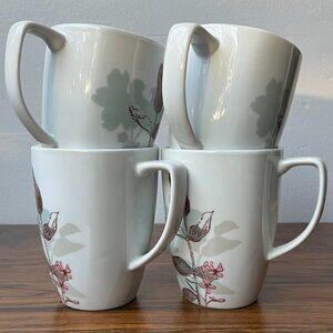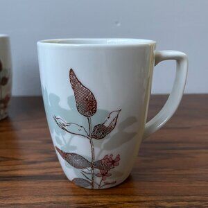Description 🌸🌸🌸 4 porcelain coffee mugs by Corelle Coordinates. The mug shape is approximately square with rounded edges. The Twilight Grove pattern features plants in muted browns, blues and pinks on both sides.