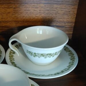 This set features a charming green floral design, perfect for enhancing your dining experience. There are 3 cups and saucers, 1 soup/cereal bowl. Enjoy your favorite tea, or add to your set.