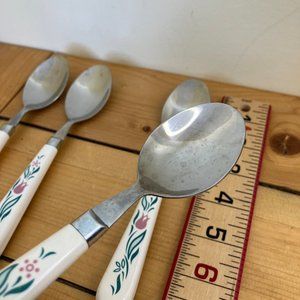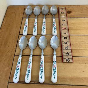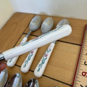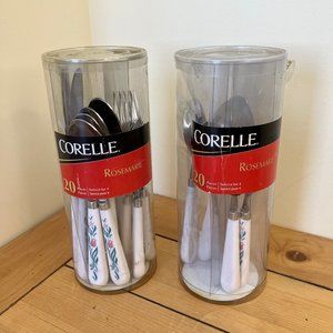 Vintage Corelle flatware cutlery set in pattern "Rosemarie", white plastic handles with floral design. Lot of 28 pieces includes: 8 soup spoons, 6 teaspoons spoons, 6 salad forks, 4 dinner forks, and 4 knives. Pre-owned condition: Several of the plastic handles have orange colored spots, and a few have black scuffs. Stainless steel has a few marks from use on a few pieces. Clear plastic packaging is worn/discolored from age with some cracks.