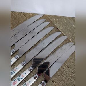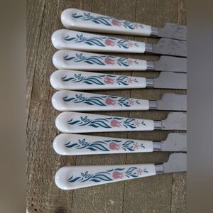 Elegant vintage Corelle Rosemarie knife set, featuring 8 pieces with charming pink floral-patterned handles. Lightweight yet sturdy, these knives are ideal for slicing, dicing, and everyday meal prep with a touch of nostalgic flair. Perfect for cottagecore, retro kitchen decor, or a complete matching set. Great condition overall: blades are sharp, handles firmly attached, light surface wear consistent with age.