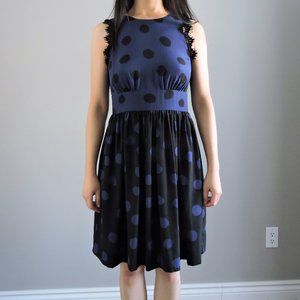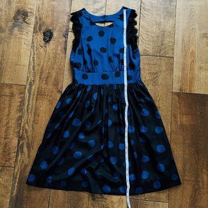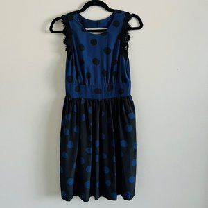 Corey Lynn Calter Blue Black Polka Dot Open Back Sleeveless Dress w/ Lace Edge