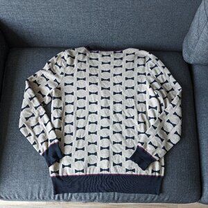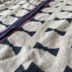 This adorable patterned cashmere cardigan from Corey Lynn Calter is in very good used condition. No noted rips, holes, stains, pulls or areas of excess wear. That said, there is some all over wash wear and the front button area is a little stretched out and the buttons appear to be pulling a little.
