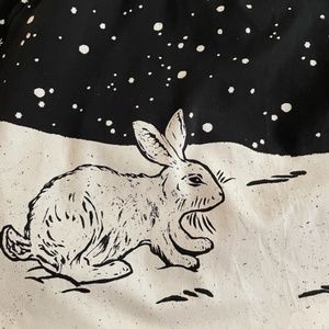 Charmingly whimsical Corey Lynn Calter X Anthropologie, Wonderland Midi Skirt in Small/Medium. This A-line skirt features a white bunny amidst snow and a starry-night sky. It is made of a thick, breathable, cotton blend, and features a built in slip. A cheerful and adorable garment for any season.