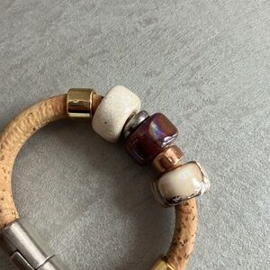 This bangle is made in a beige cork, and features marbled and solid ceramic beads in cream and maroon hues; metal hardware in gold, bronze, and silver tones; and a magnetic snap closure.