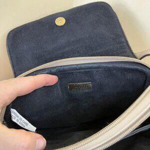 Cornell brand floral tapestry purse has beige faux-leather trim & shoulder strap. Lined in black velveteen fabric. Front flap has gold-tone logo and a magnetic closure. Inside of purse has two large compartments with zip closures, 6 card pockets, and two outer pockets - front one has a zip closure, back one is an open pocket. Pre-owned condition: zipper pulls have a few spots where paint is missing. 8 1/2" long x 6" tall x 2 1/2" thick. Strap adjusts from approx. 45-50".