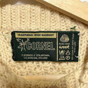 This is a Cornell hand knit made in Ireland cable-knit fisherman sweater, characterized by its distinctive textured patterns representing traditional Irish fishing ropes.