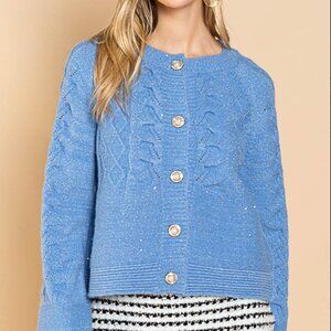 Elevate your knitwear collection with this dreamy blue cable knit cardigan, designed with a modern twist. The intricate cable and diamond stitch patterns are highlighted with subtle metallic threads that add a hint of shimmer to every move. Featuring statement gold-rimmed pearl buttons, this cardigan balances timeless elegance with contemporary flair.