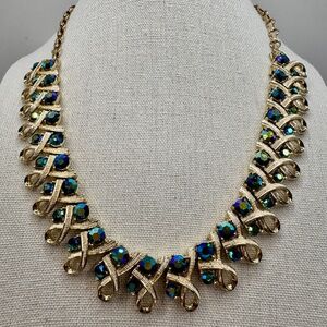 This lovely vintage Coro choker necklace features textured gold toned ribbon links and sparkling iridescent blue aurora borealis rhinestone crystals. Necklace measures 16.5” long and is finished with a hook clasp which allows it to be an adjustable length. Stamped Coro on the back of the hook.