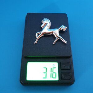 This figural pony pin features a graceful running horse. The raised mane, extended stride, and sleek, sculpted body create a vivid sense of movement—making it a standout accessory on jackets, scarves, hats, or display.